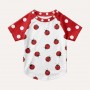 Основна тканина — м’який білий трикотаж, всіяний яскравими червоними сонечками (божими корівками), що виглядають живо, грайливо і дуже по-доброму. Вони ніби розбіглися по всій футболці, додаючи образу легкості та безтурботності. Це той принт, який одразу викликає усмішку — і у вас, і у всіх навколо.