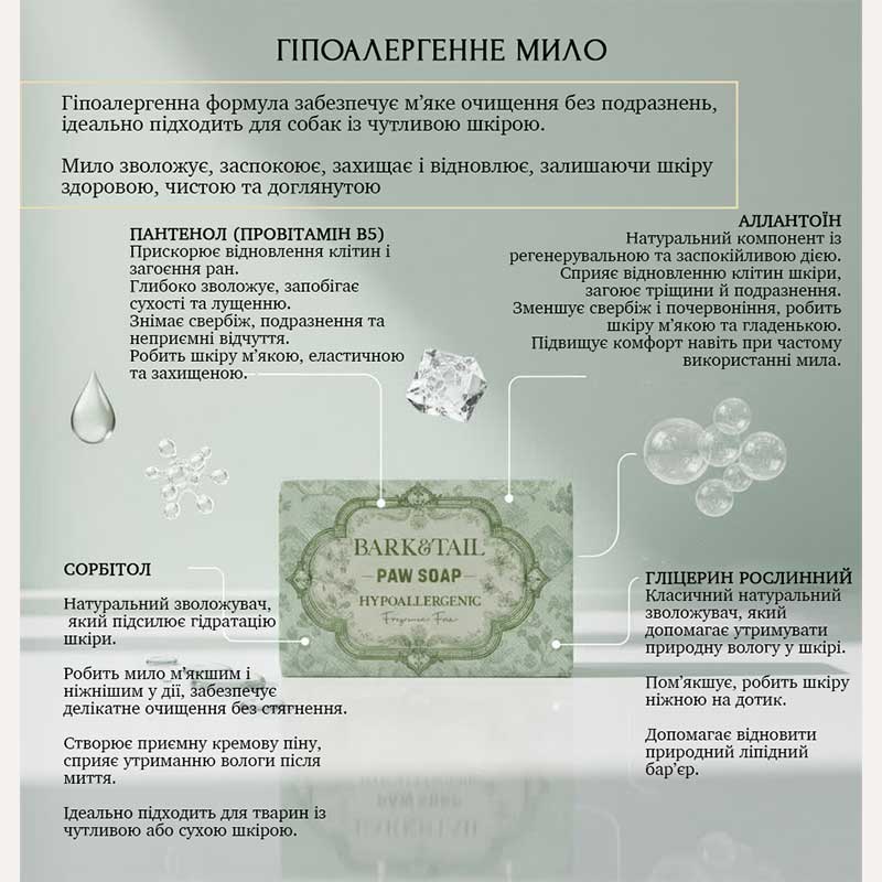 М’які зволожувачі — сорбітол і рослинний гліцерин — допомагають утримувати природну вологу, роблять шкіру лап і тіла м’якою, гладкою й еластичною, запобігаючи пересиханню.