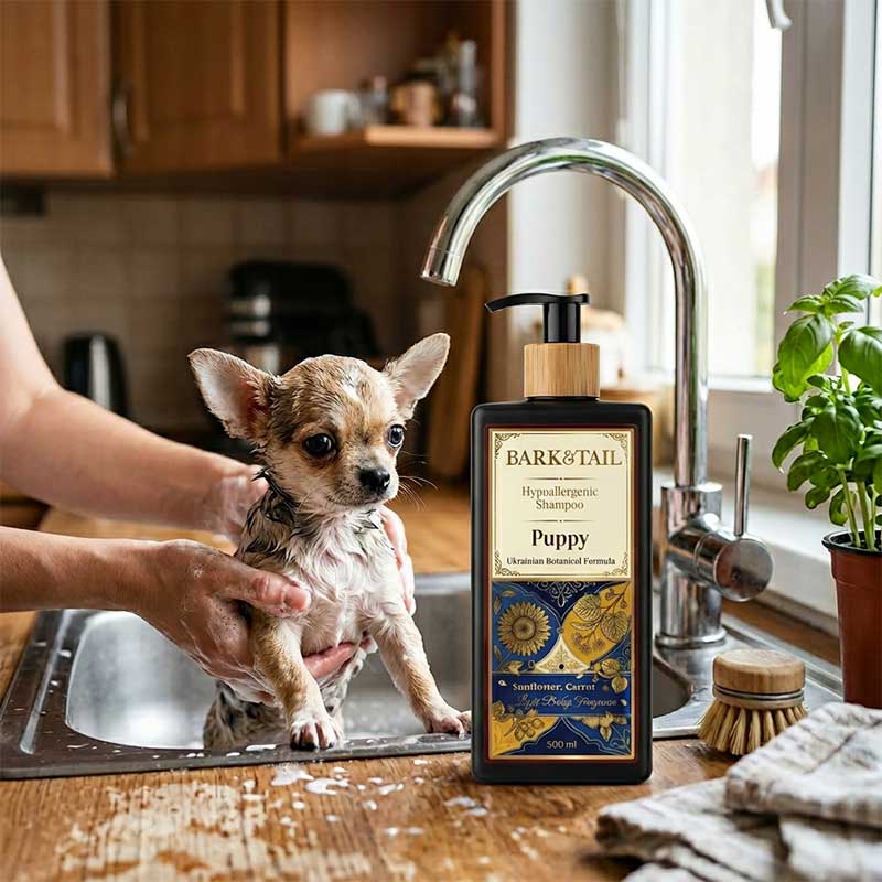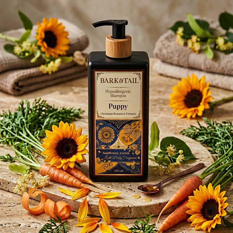 Ніжний шампунь для цуценят, створений з урахуванням особливо чутливої шкіри та м’якої шерсті. Збагачений дарами української природи.