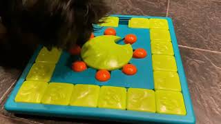 Іграшка-головоломка MultiPuzzle від Nina Ottosson дасть можливість не тільки добути ласощі або корм в ігровій манері, але і змусить вашого собаку подумати і потренувати мозок. Якщо ви знайомі з інтерактивними іграшками Nina Ottosson, то знаєте, що вони розподіляються за складністю на 4 рівні. MultiPuzzle - 4 рівень складності, або Expert. Це наразі найскладніша іграшка від Nina Ottosson. У четвертому рівні собака має низку послідовних завдань та мусить проявляти не лише активність, але й долучати розум, кмітливість і логічне мислення. Аби здобути приховані ласощі, собака повинна не просто пошкрябати іграшку лапою, а зрозуміти, що спочатку треба прокрутити колесо, потім просунути блок і т.д. Тобто складність іграшки у послідовності етапів, які мусить подолати собака, щоб отримати частування. Іграшка MultiPuzzle складається з центрального колеса, що обертається і дає змогу просунути один з блоків, під яким сховані ласощі. Всього в іграшці 8 таких блоків. По периметру іграшки проходить низка з 20 отворів для ласощів, 19 з яких закриті плиточками. Кожна плитка сувається взад і вперед, відкриваючи отвори з ласощами. Але собака повинен зрозуміти, що починати здобувати ласощі носом чи лапами слід біля 20-ї плитки, тобто порожньої ніші. Лише з цього місця плитки можно буде пересунути одну за одною. MultiPuzzle можна ускладнити стопами, що заблокують пересування плиток у деяких місцях. Це призведе до того, що песику буде потрібно почати все спочатку, але вже з іншого боку.