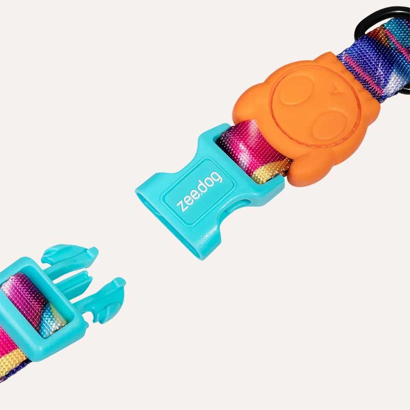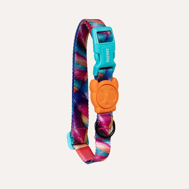 Цей нашийник виглядає так, ніби народився в цифровому сні, де повітря наповнене гелієм, а форми не знають ваги. М’які, блискучі хвилі кольору — електричний синій, фуксія, помаранчевий — переплітаються, мов об’ємні кульки, готові злетіти. Це принт, що не намагається бути серйозним. Він грається. І запрошує гратися разом.