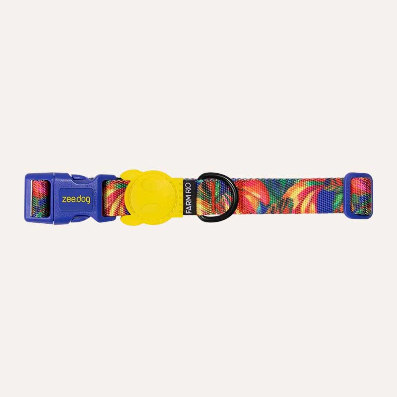 Версія Samba, створена у співпраці з FARM Rio, — це вибух кольору без крику. Тропічний візерунок із листя та яскравих штрихів червоного, жовтого й зеленого на глибокому синьому тлі несе в собі бразильську легкість і життєрадісність. Це нашийник, який не просто видно — його відчувають.