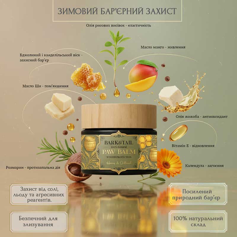 • Восковий бар’єр (Cera Alba + Candelilla Wax) створює на поверхні лап гладку захисну плівку, яка перешкоджає проникненню солі, вологи, снігу і хімікатів. Сіль і реагенти часто «витягують» вологу з шкіри та підсилюють подразнення — бар’єр зменшує їх контакт зі шкірою.