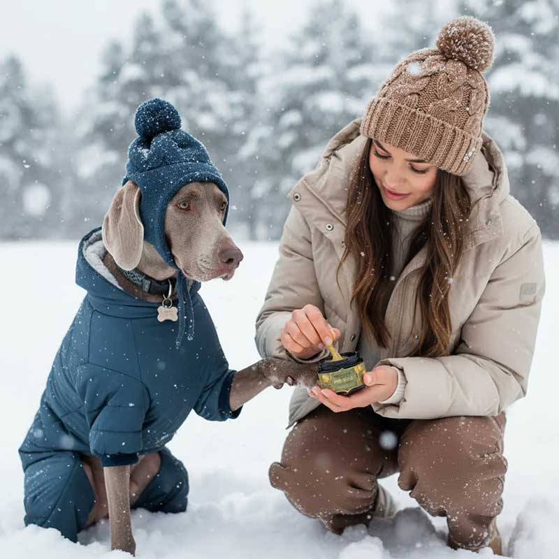 Зимовий захисний бальзам для лап собак — посилена формула, створена для щоденного захисту в холодну пору року. Допомагає уберегти подушечки від впливу криги, снігу, солей та хімічних реагентів, якими часто посипають дороги взимку. Створює еластичний восковий бар’єр, який утримує вологу та зменшує контакт шкіри з агресивними зовнішніми факторами, попереджаючи появу сухості, подразнень і тріщин.