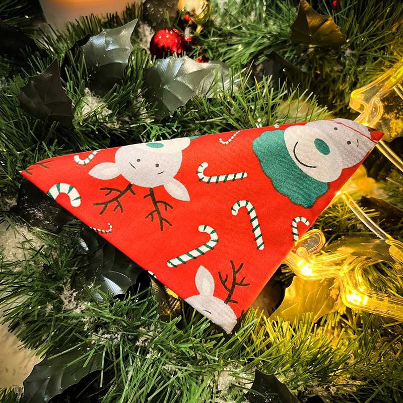 Ця різдвяна бандана для собак та котів виконана у яскраво-червоному кольорі, що одразу створює святковий настрій. Тканина прикрашена милими зображеннями усміхнених оленят з ріжками та затишними зеленими шарфами, що додає бандані тепла та грайливості. Доповнюють дизайн святкові цукрові палички білого та зеленого кольорів, які гармонійно контрастують із червоною основою.