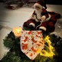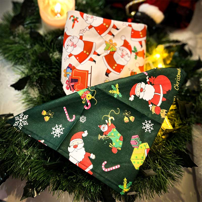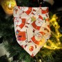Ця різдвяна бандана для собак і котів наповнена святковим настроєм та чарівністю зимових свят. Виконана з м'якої тканини світлого кольору, вона прикрашена яскравими малюнками Санта-Клауса, подарунків, святкових санчат і різдвяного декору. Веселий дизайн додає грайливості та робить її ідеальним аксесуаром для новорічних святкувань.