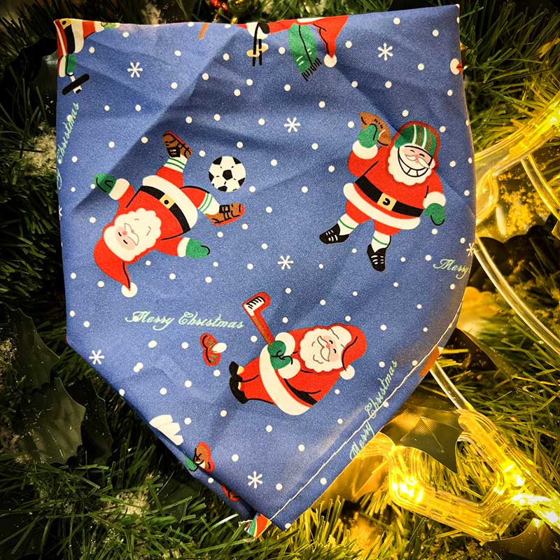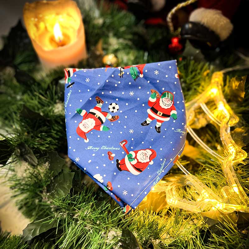 Ця різдвяна бандана для собак і котів наповнена святковим настроєм та чарівністю зимових свят. Виконана з м'якої тканини блакитного кольору, вона прикрашена яскравими малюнками Санта-Клауса, що практикує різноманітні види спорту. Веселий дизайн додає грайливості та робить її ідеальним аксесуаром для новорічних святкувань.