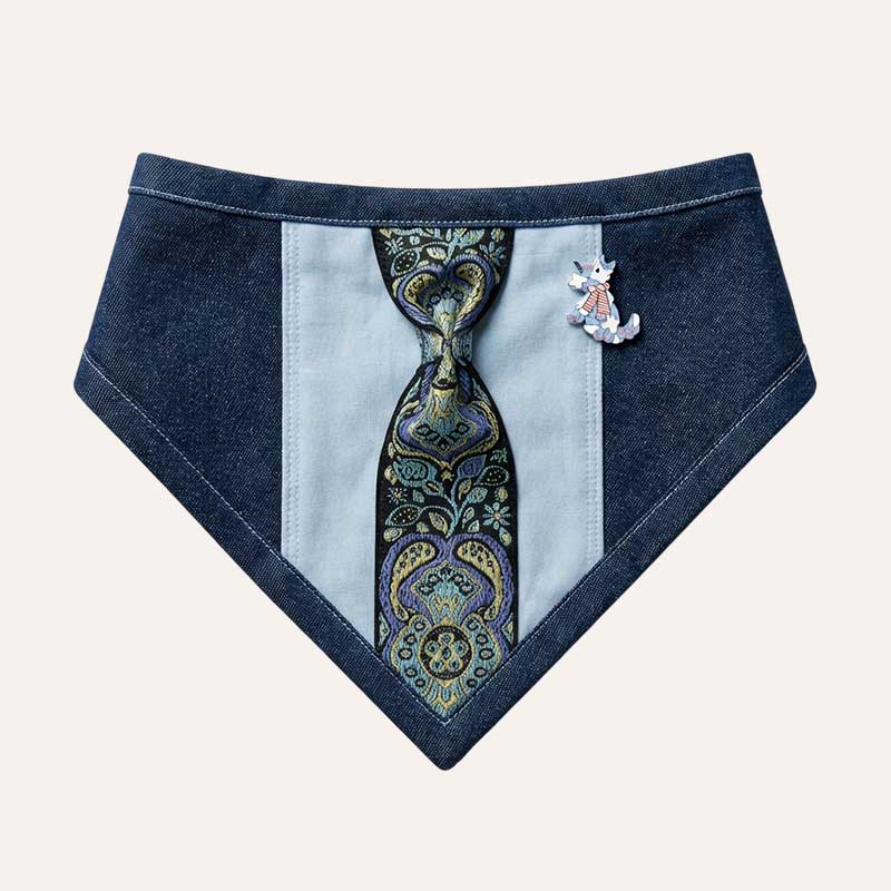 Основа сделана из темного джинса — серьезного, молчаливого, держащего форму и репутацию. Поверх него — голубая имитация рубашки из хлопчатобумажной ткани: свежая, аккуратная, без лишних вопросов. По центру — имитация галстука из декоративной ленты с узором, который выглядит так, будто его завязали утром без зеркала, но с характером.
