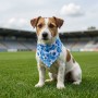 Это бандана, которую легко представить на прогулке возле футбольной площадки, когда мяч катится по траве, а песик уже готов первым догнать его.