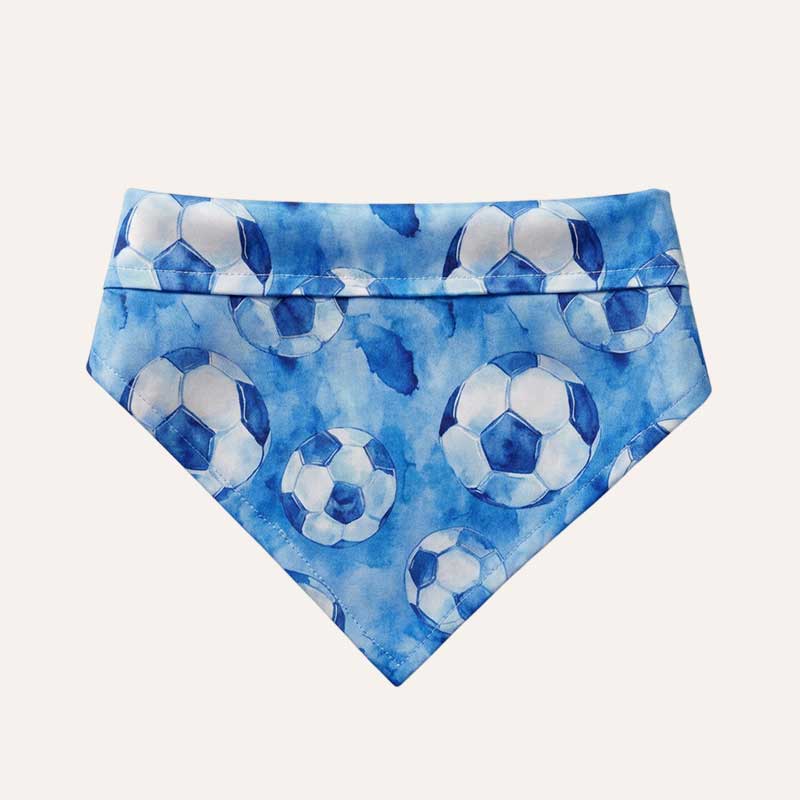 Это бандана, которую легко представить на прогулке возле футбольной площадки, когда мяч катится по траве, а песик уже готов первым догнать его.