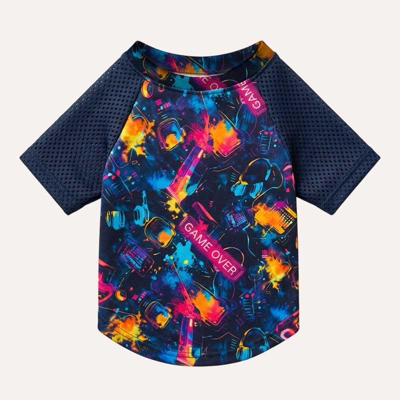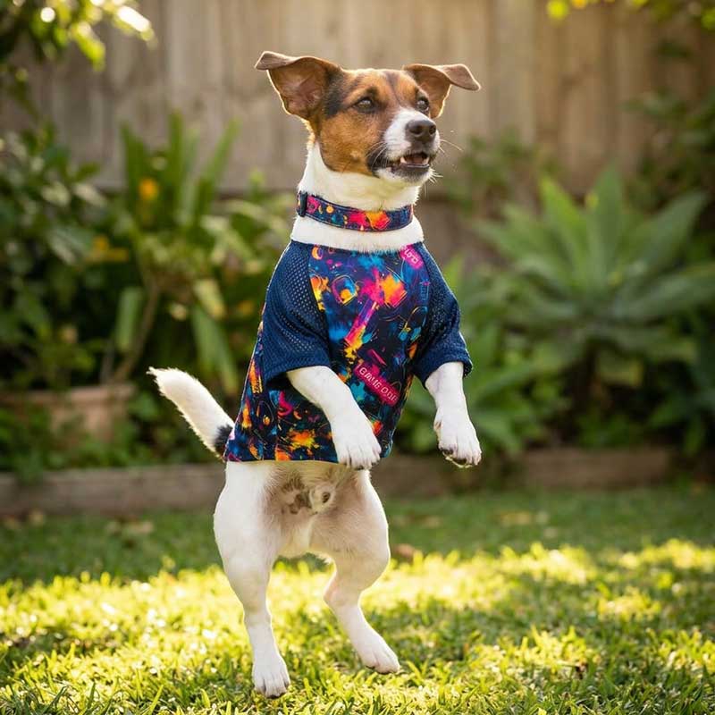 Рукава выполнены из темно-синей спортивной сетки – легкой, дышащей, идеальной для теплой погоды. Она придает футболке еще больше спортивного характера и делает ее комфортной даже в жару. Это тот вариант, когда собаке не жарко, ничего не парит и можно спокойно бегать, играть и жить свой самый лучший день.