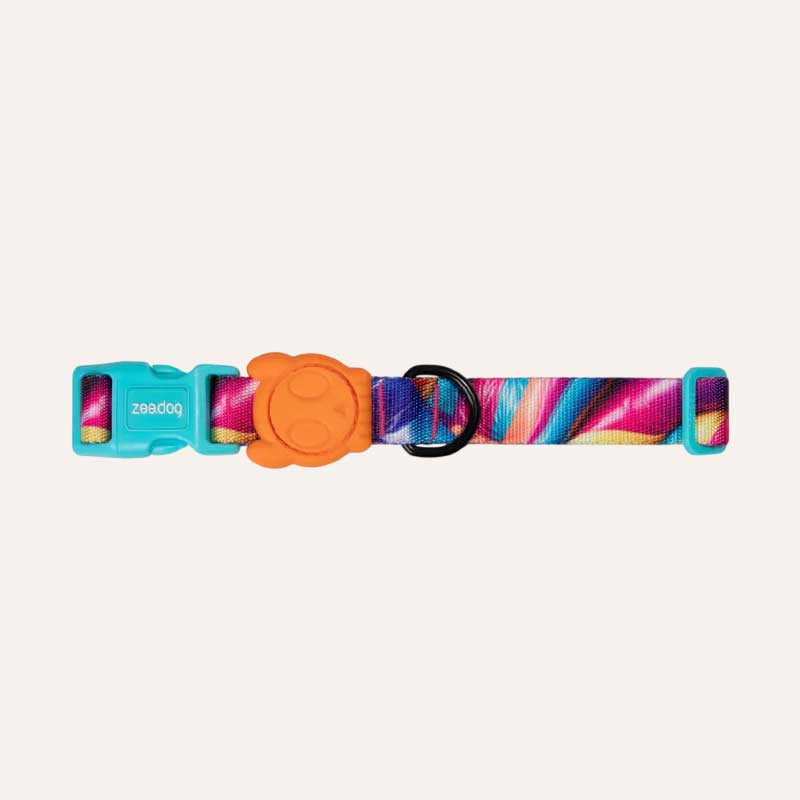 Этот ошейник выглядит так, будто родился в цифровом сне, где воздух наполнен гелием, а формы не знают веса. Мягкие, блестящие цветные волны — электрический синий, фуксия, оранжевый — переплетаются, словно объемные шарики, готовые взлететь. Это принт, не пытающийся быть серьезным. Он играет. И приглашает играть вместе.