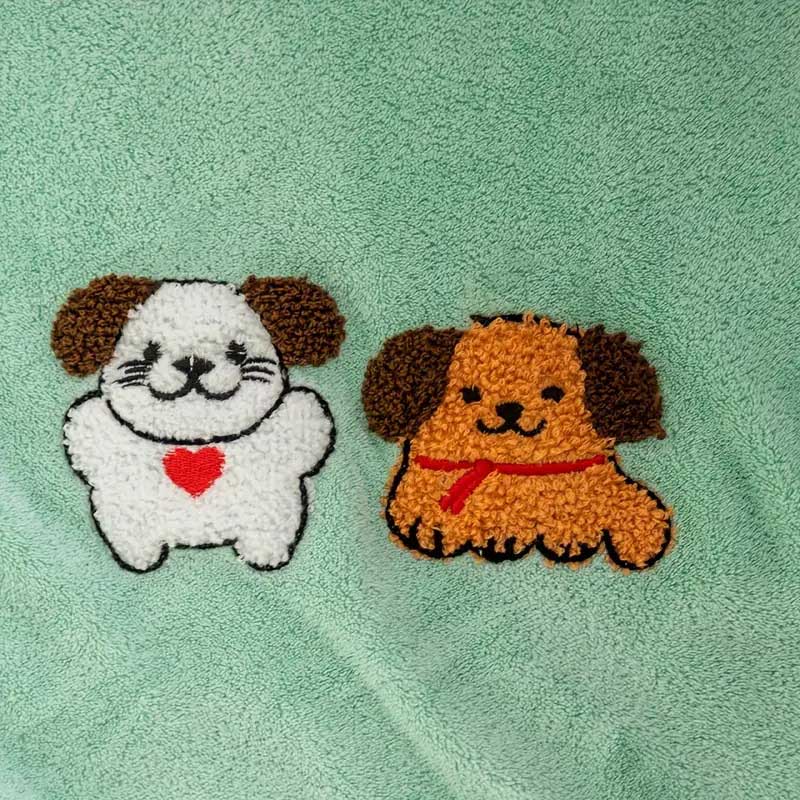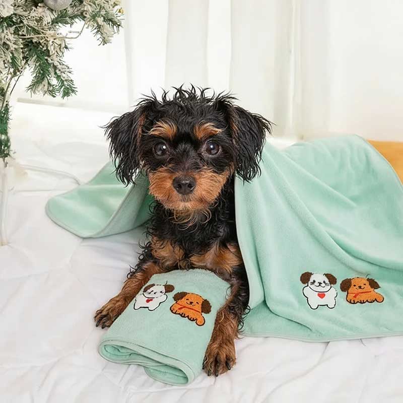 Полотенце украшено вышитыми собачками на мятном фоне — оно сразу вызывает улыбку! Стильный рисунок добавляет настроения и однозначно показывает, что это полотенце принадлежит вашей собачке.