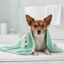 Материал из микрофибры очень мягкий, легкий и при этом прекрасно впитывает влагу. Он нежно высушивает шерсть, не электризируя и не раздражая кожу. Благодаря гладкой структуре ворса полотенце быстро сохнет после использования.