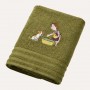 Это полотенце цвета хаки – не просто вещь, а маленькая сцена из жизни, где все уже понятно без слов. На нем — хозяйка, немного хитрая, немного нежная, манит своего терьера к тазику, мол: "Иди-ка сюда, сердечко, ничего страшного... смотри, уточка!" А терьер — еще философ: смотрит, сомневается, но уже почти согласился. И вот в этой вышивке целая история, живая, забавная, немного по-домашнему правдивая.