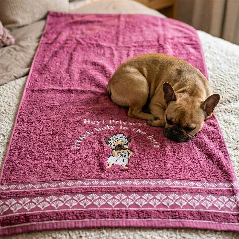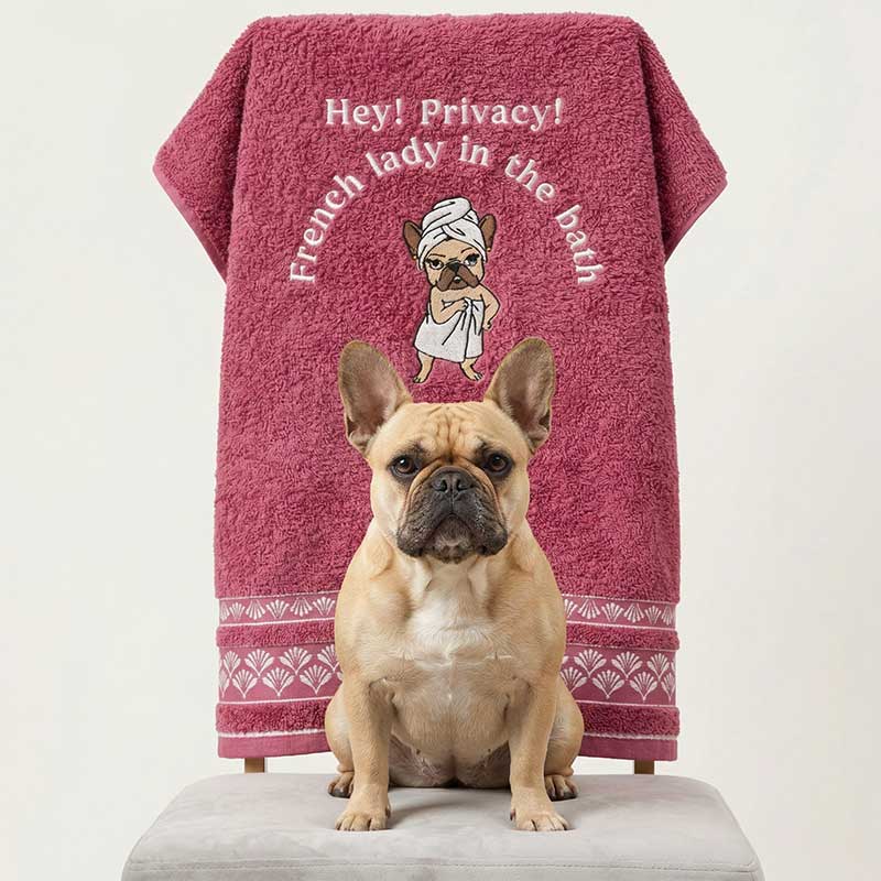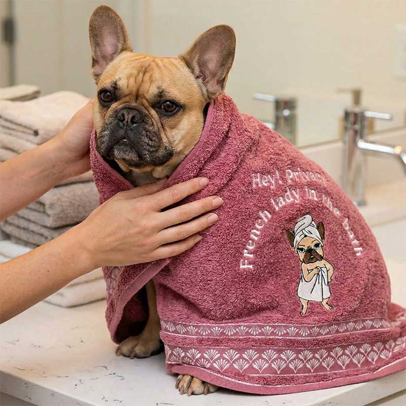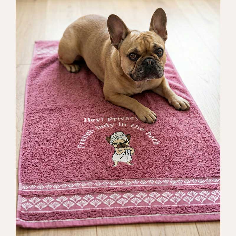 Темно-малиновый, насыщенный, он сразу задает тон: сегодня в ванной настоящая леди. На вышивке — французский бульдог со взглядом, в котором читается все: "Hey! Privacy! French lady in the bath". И действительно, здесь вам не шутки – это момент личного спа, и лучше не вмешиваться без приглашения. Маленькая героиня завернута в полотенце, немного капризная, немного кокетливая — и абсолютно уверена, что весь этот мир сейчас работает на ее комфорт.