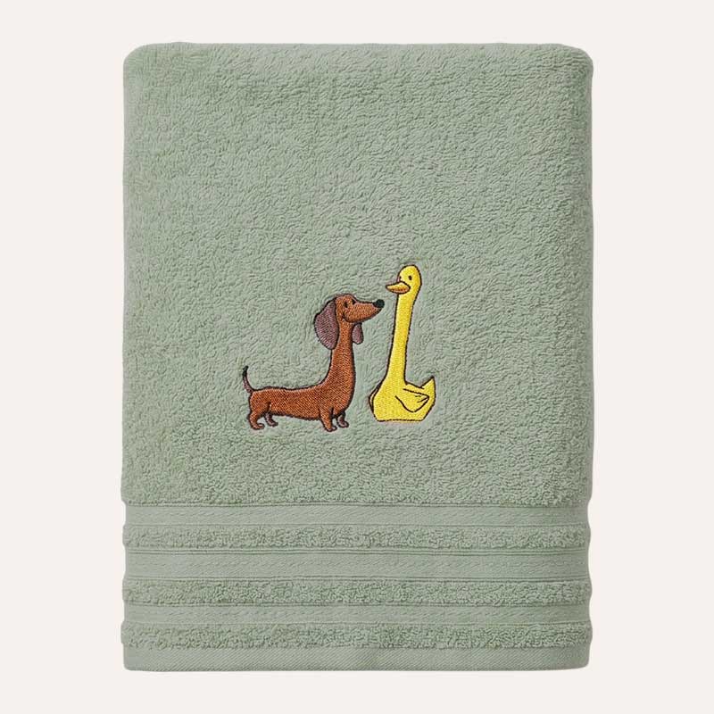 Это полотенце в темно-мятном оттенке — именно такое. Спокойный, благородный, он сразу успокаивает и вас, и вашего мокрого после ванны озорника. А посреди этого покоя – маленькая сценка: такса, вытянутая, как струна, с интересом смотрит на резиновую утку. И в этом взгляде — вся суть: игра, легкое упрямство и та же собачья философия.