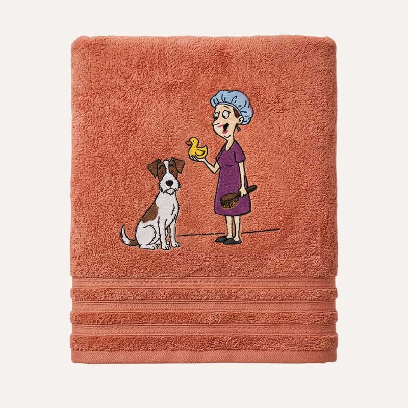 Этот именно такой. Теплый лососевый цвет, и посреди него сцена, знакомая каждому владельцу собаки: хозяйка, с той же терпеливой улыбкой, держит резиновую утку, как аргумент последней надежды. А собачка сидит и смотрит… ну, скажем честно, с легким скепсисом. Типа: «Серьезно? Ты думаешь, я куплюсь на утку и полезу сам купаться?»