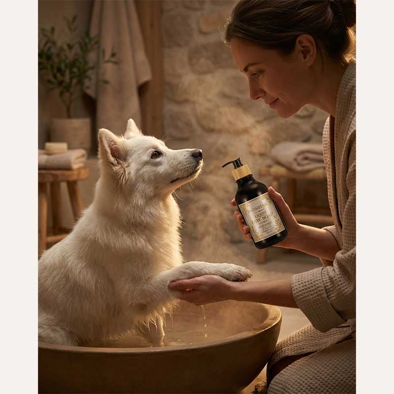 Натуральное очищающее мыло для собак с белыми лапами и светлой шерстью. Формула специально разработана для деликатной очистки и восстановления белья шерсти без использования агрессивных отбеливателей и опасных компонентов.