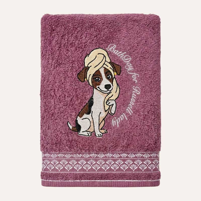Цей темно-малиновий красень створений саме для тієї, що ходить з характером, дивиться з вогником і точно знає, що вона — леді. На вишивці — Джек Рассел, трохи кокетка, трохи акторка, загорнута в рушничок, ніби щойно після ванни, і напис, що звучить як маленьке заклинання догляду: “Bath day for Russell lady”. І все — крапка. Бо якщо у вас є Russell lady, то у неї просто не може не бути свого рушника. Це ж, пробачте, не абияка собака, а персона з настроєм і стилем. А під цією сценкою — ще один штрих, майже як тихий післясмак: витончений орнамент, вишитий уздовж краю рушника. Він додає завершеності, ніби рамка для картини, і робить річ не просто практичною, а по-справжньому декоративною. Це вже не просто рушник після прогулянки чи ванни — це частина інтер’єру, частина настрою, частина маленького ритуалу догляду.