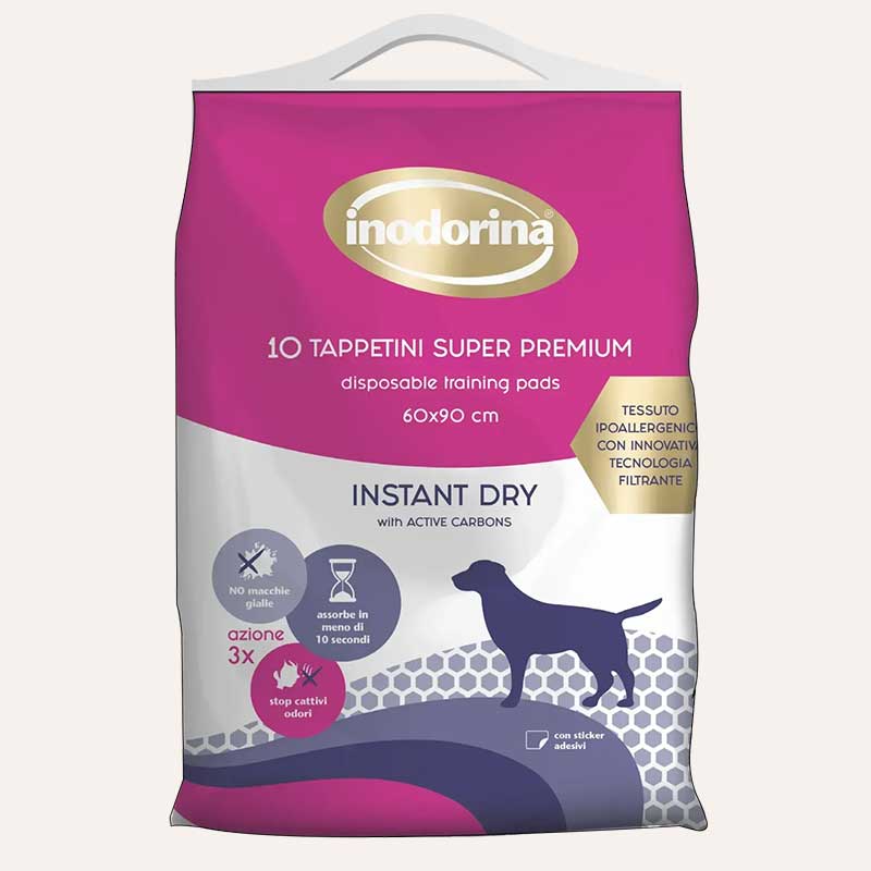 Швидкопоглинаючі пелюшки Inodorina Instant Dry — це одноразові пелюшки створені для зручності власників та комфорту улюбленців у будь-який період життя. Вони допоможуть цуценятам швидко навчитися справляти потреби в потрібному місці, стануть у нагоді літнім собакам або тваринам у період відновлення після хвороб.