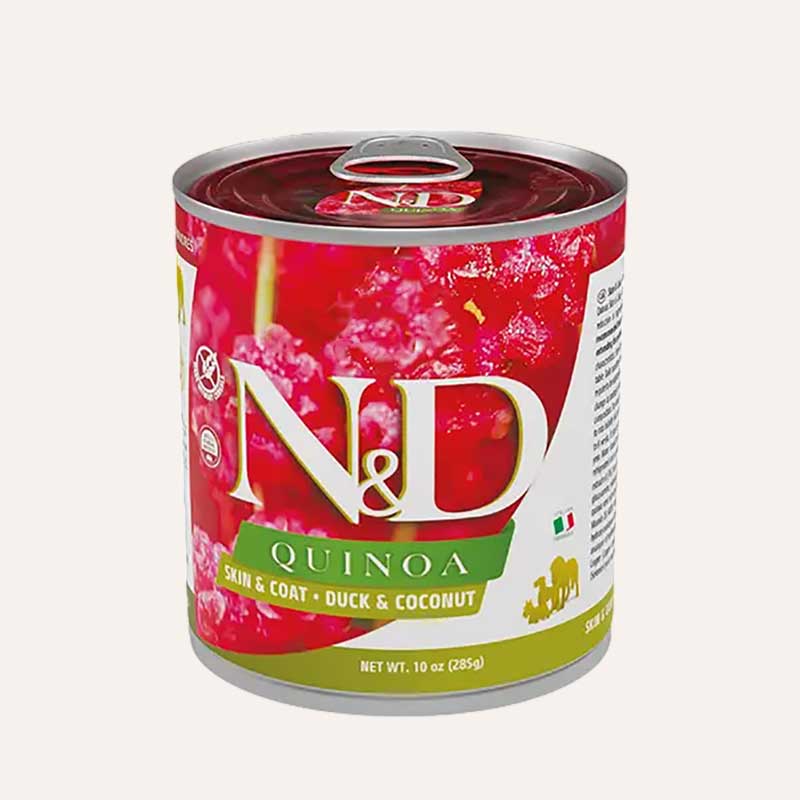 Повнораціонний дієтичний корм для дорослих собак.ND Quinoa Skin Coat – Duck Coconut – повнораціонний дієтичний корм для собак, рекомендований для зменшення непереносимості інгредієнтів і поживних речовин.